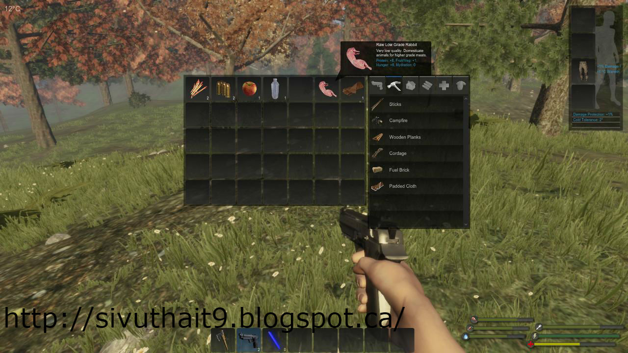 Its a typical wilderness survival game set in modern times.You start in the middle of nowhere with a pistol with eight shots,an axe, a glow-stick,an apple,a water bottle and some matches. The goal is to survive the wilds and eventually build a base.